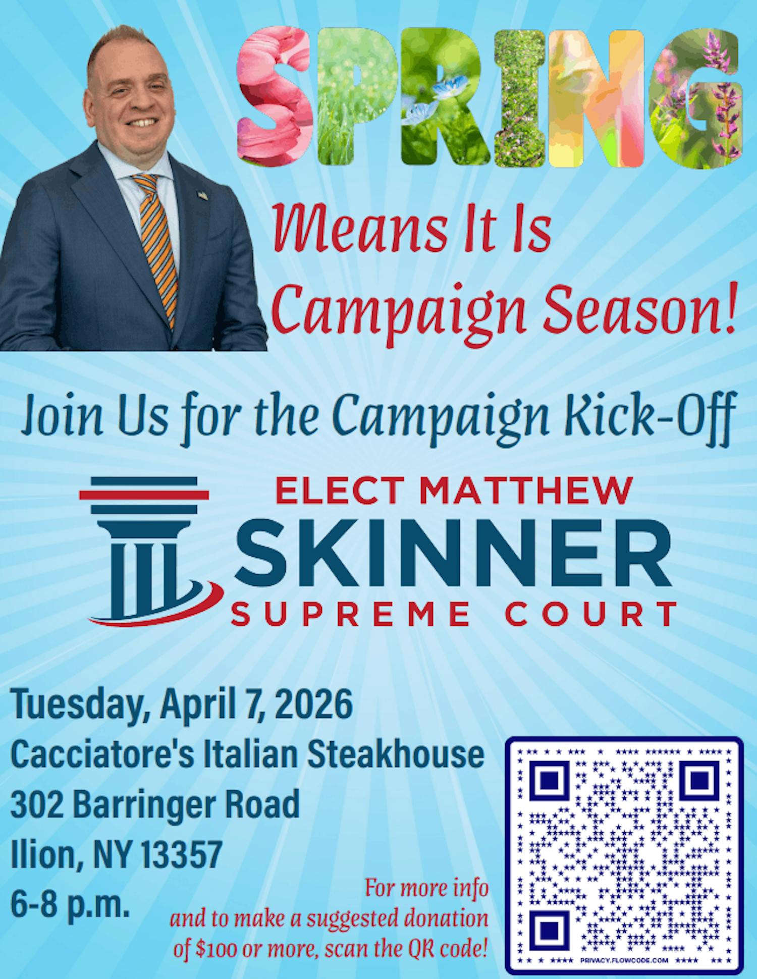 You're cordially invited to attend a campaign kickoff event for Matthew Skinner, candidate for New York State Supreme Court, Fifth Judicial District! Please see the event details below, as well as a flyer.