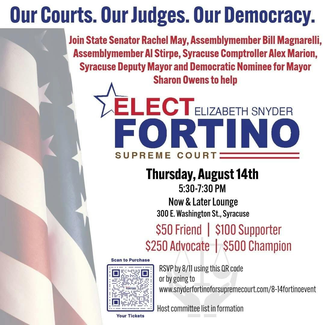 You're cordially invited to attend a fundraiser in support of Elizabeth Snyder Fortino, candidate for Supreme Court Justice, Fifth Judicial District! Please see the event details below, and feel free to share the flyer beneath this message far and wide with friends, family, on social media, etc.