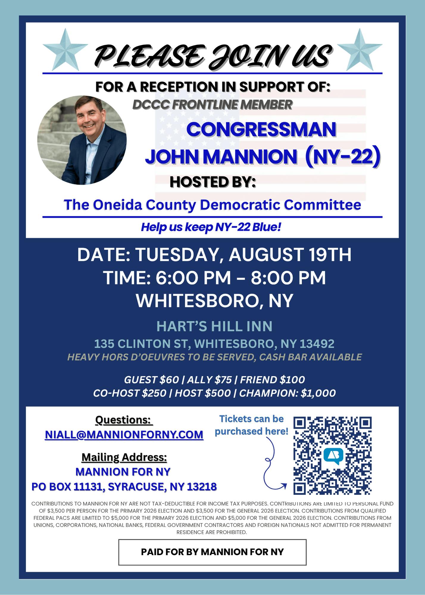 You're cordially invited to attend a reception in support of NY-22 Congressman John Mannion, hosted by us, the Oneida County Democratic Committee! Please see the event details below, and feel free to share the flyer beneath this message far and wide with friends, family, on social media, etc.