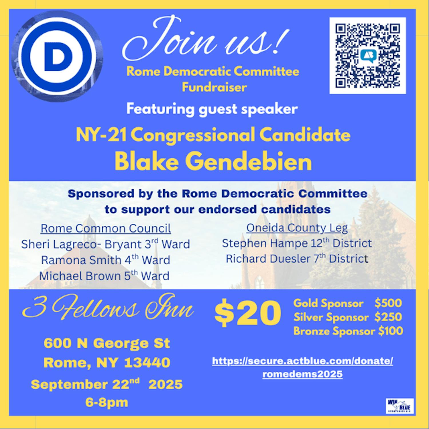 You're cordially invited to attend the Rome Democratic Committee Fundraiser featuring guest speaker Blake Gendebien, NY-21 congressional candidate!
